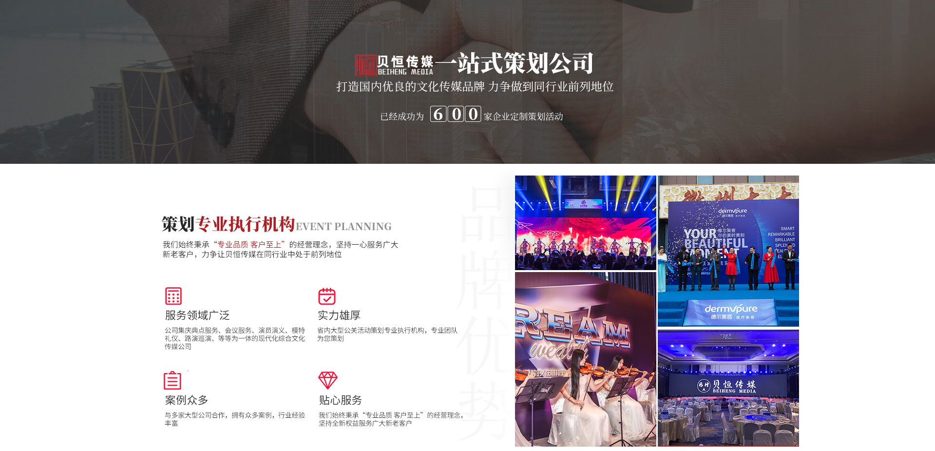 - 合 肥 貝 恒 文 化 傳 媒 專(zhuān)注·專(zhuān)業(yè)·專(zhuān)心·效率 合肥貝恒文化傳媒有限公司2017年成立于安徽·合肥,是省內(nèi)大型公關(guān)活動(dòng)策劃專(zhuān)業(yè)執(zhí)行機(jī)構(gòu),公司集慶典服務(wù)、會(huì)議服務(wù)、演員演藝、模特禮儀、路演巡演、展會(huì)特裝、廣告制作、設(shè)備租賃、舞美策劃、企業(yè)形象宣傳等為一體的現(xiàn)代化綜合文化傳媒公司,我們始終秉承“專(zhuān)業(yè)品質(zhì)客戶(hù)至上”的經(jīng)營(yíng)理念,堅(jiān)持全...